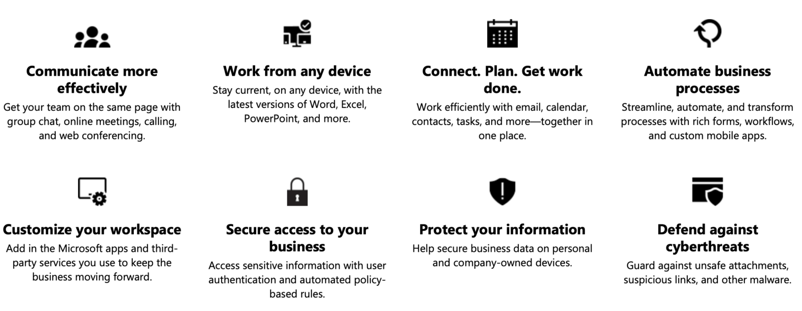Microsoft 365 is a platform with all the tools your business needs (and more) for productivity, security, and collaboration. From workflow automation to a customized workspace, Microsoft 365 offers a comprehensive selection of features.